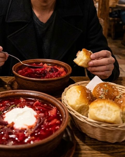 As the morning chill settled, I sought out the ultimate Ukrainian comfort food: Borscht. I found a cozy cellar-style tavern where the soup was served deep crimson, rich with beets, and topped with a generous dollop of smetana (sour cream). Paired with Pampushky—soft garlic bread rolls—it was easily the best meal of my entire trip.